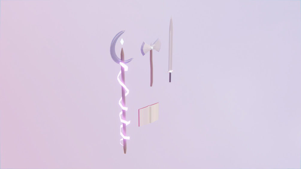 Free to use in all of your projects, no credit necessary. Comes with a sword, magical staff, axe, and a book.